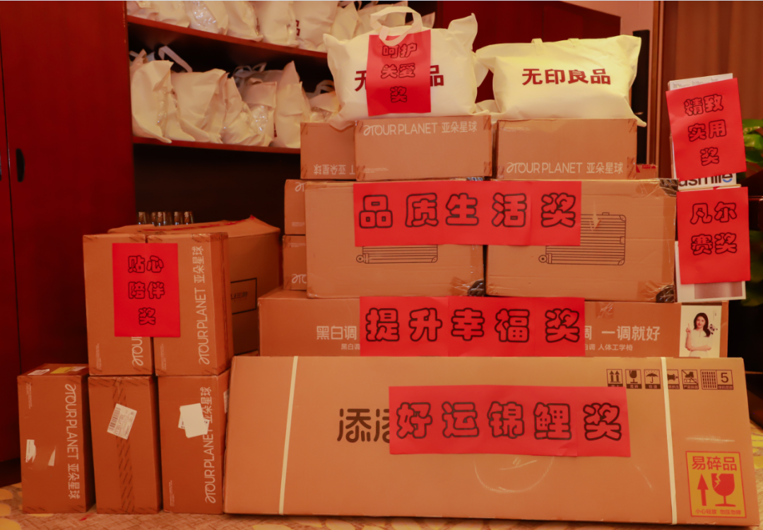 庆典重头戏来啦,那就是少不了的抽奖环节,今年的奖品设置非常有趣:好运锦鲤奖、凡尔赛奖、提升幸福奖、品质生活奖、精致实用奖、贴心陪伴奖、呵护关爱奖。抽奖环节现场高潮迭起,来看看是哪些幸运儿抱得大奖归?值得一提的是,奋战在一线没能来到现场的几位同事,由部门助理代领,也抽到了大奖。我们借此机会向他们表达最深的祝福与感谢,感谢他们在前线的辛勤付出。